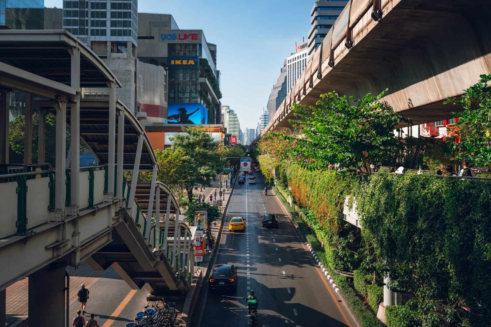 View of Sukhumvit Road in Bangkok with traffic and elevated walkways